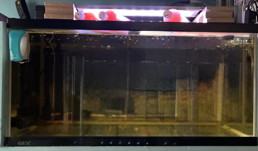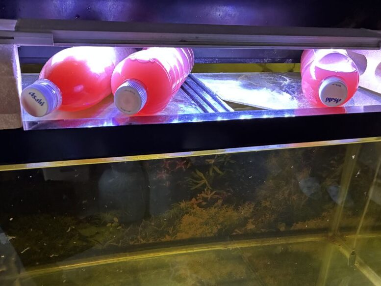 ペットボトルで遮光して光量調整 - 水質安定のための水換え、掃除は1回/2週 程度